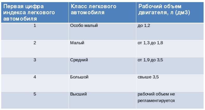 Система классификации в Советском Союзе разделяла весь автопарк по объему двигателя на пять классов. В России на сегодняшний день этот документ не является законным, носит рекомендательный характер. Разделение на классы по рабочему объёму двигателя: