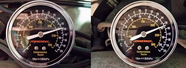 - Подача воздуха через закрытую дроссельную крышку при измерении компрессии уменьшается, и показатель ее будет низким (от десяти до одиннадцати атмосфер).