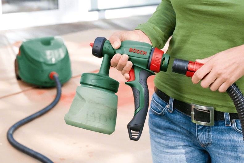 - Bosch PFS 5000E. В комплектацию входит шланг длиной около четырех метров. Краскопульт приходит в действие с помощью мотора. Оборудование имеет зеленую расцветку. Электрический краскопульт этой марки хорошо подходит для окрашивания крупных объектов.
