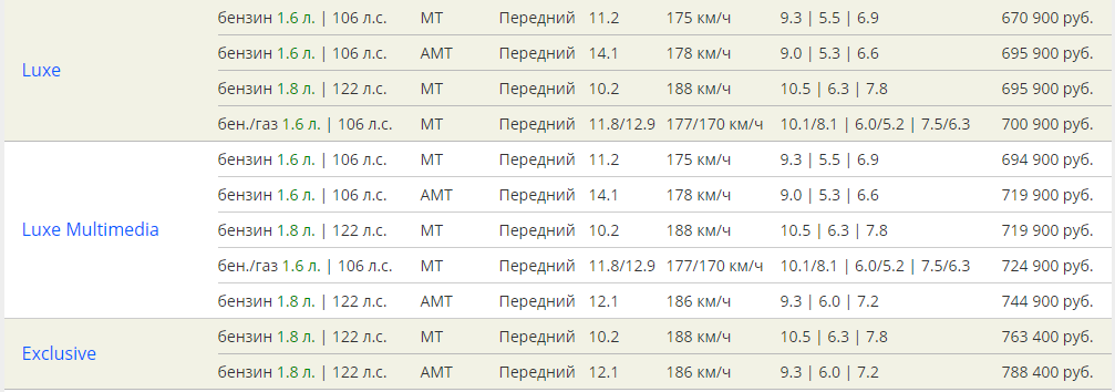 Имеет самое богатое оснащение, что поставляется с бензиновым двигателем 106 л.с. и АКПП, МКПП, стоимость которых 710 и 685 руб. соответственно. Можно купить седан, работающий на газе и бензине. Стоит данная версия 715 тыс. руб. Устанавливается и бензиновый двигатель 1.8 литров мощностью 122 л.с, передающий усилие ведущим колесам через АКПП. В таком исполнении автомобиль стоит 735 тыс. руб.