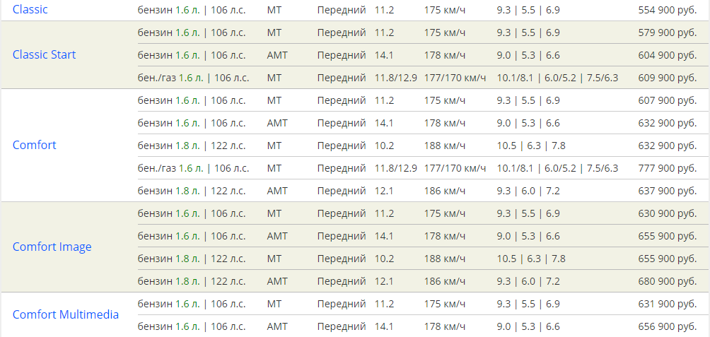 Отметим, что расход топлива указан в литрах на сто километров: в городе/на трассе/в смешанном цикле. Коробка передач: МТ — механика, АТ — автомат, АМТ — автоматическая (робот).