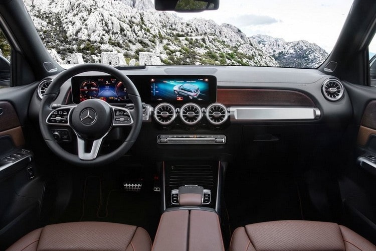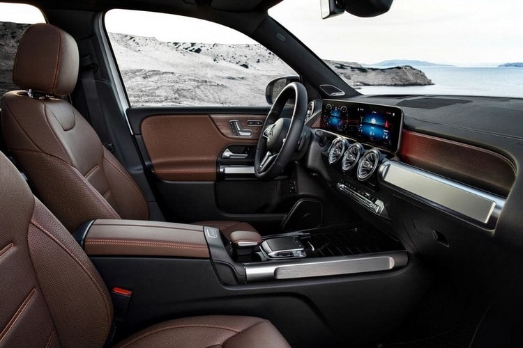 Внутри нового Mercedes-Benz GLB 2020 года все соответствует премиальному классу. Отделка салона из кожи, она дополнена многочисленными элементами из ценных пород древесины, карбона, металла. На передней панели установлен большой цифровой экран информационно-развлекательной системы.