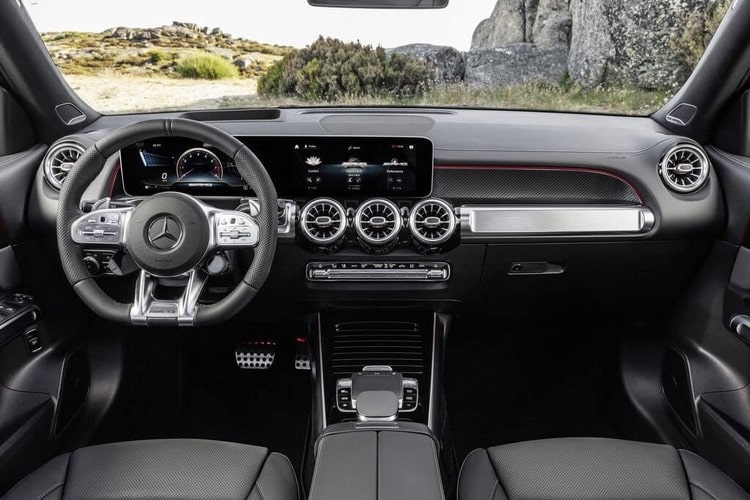 Салон нового Мерседес-АМГ ГЛБ 35 мало чем отличается от стандартных модификаций, однако небольшие нотки в сторону спортивного стиля все-таки присутствуют. В первую очередь, это привычное для AMG спортивное рулевое колесо со скошенной нижней частью, а также перфорированной оплеткой в местах, где водитель держится руками.