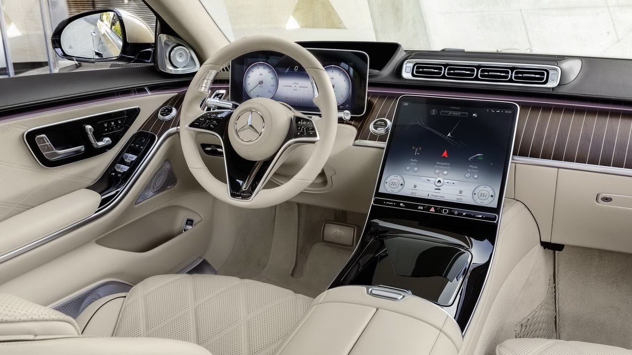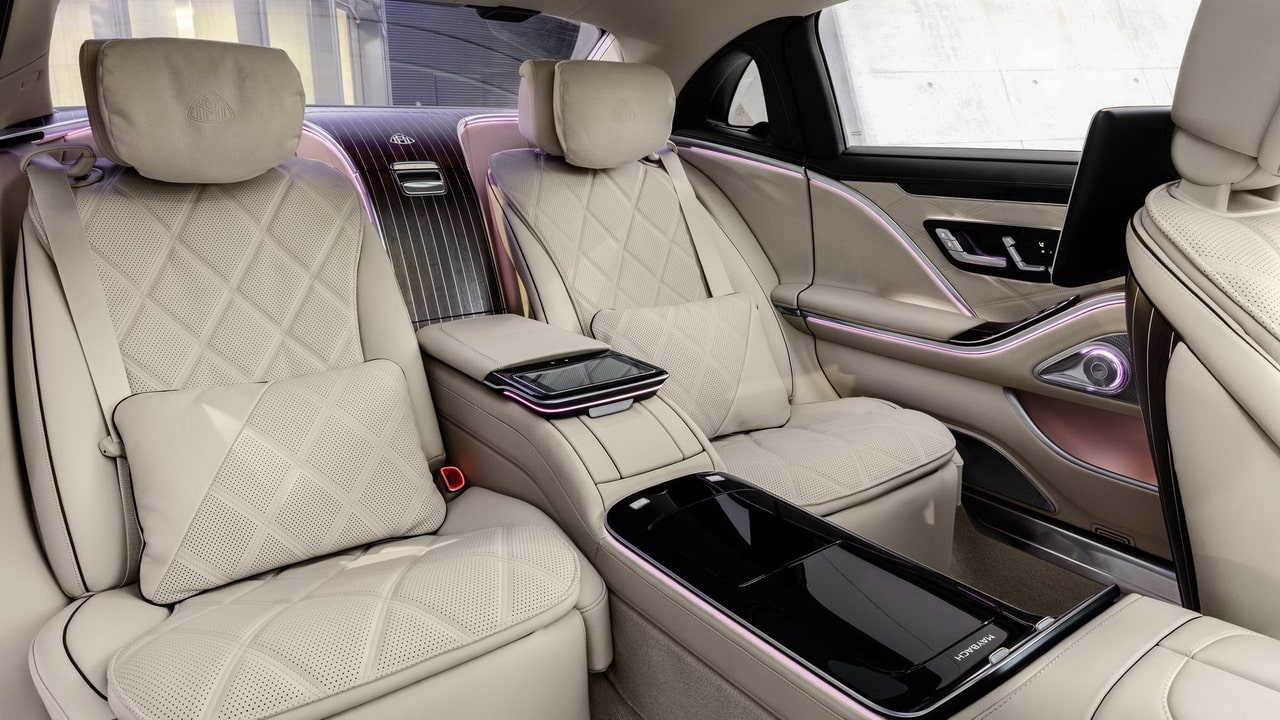 Передняя часть напоминает S-класс, а вот задняя полностью изменена и наполнена роскошью. Уже в базовой версии задние пассажиры получают шикарные кресла с вентиляцией, многочисленными режимами регулировки, массажем и даже подставками для ног.