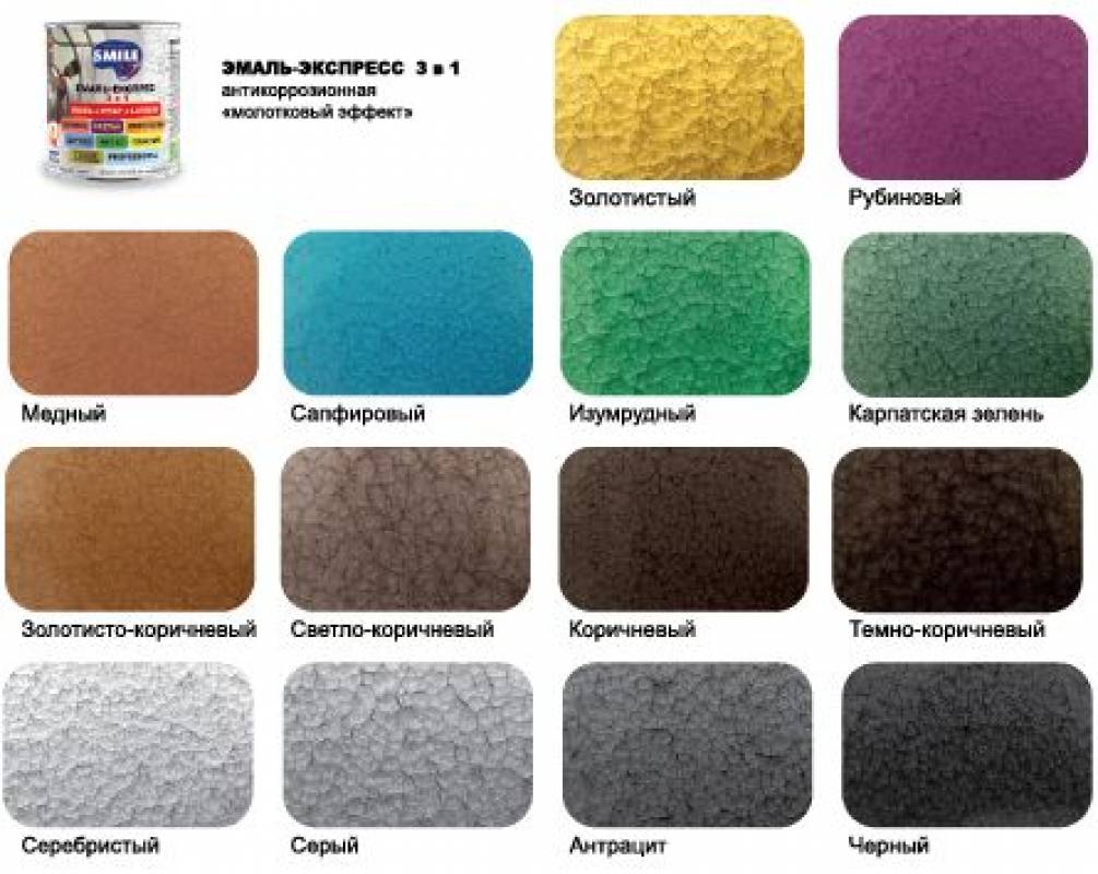 Изначально цветовая гамма молотковой краски была однообразна. В продаже был только серый цвет. Но со временем покрытие стали применять в декоративных целях, и палитра увеличилась. Отличительной особенностью ЛКМ являются металлический блеск и интересная фактура.