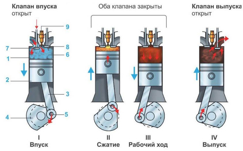 Четырёхтактный двигатель должен вовремя загрузить рабочий объём нужным количеством (и качеством) топливовоздушной смеси, сжать её, своевременно поджечь и дать потратить тепловую энергию на расширение объёма при максимуме давления на поршень.