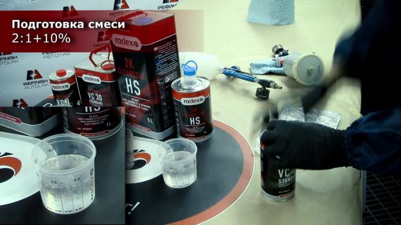 Акриловый лак HS представляет собой двухкомпонентную систему и затвердевает в основном в соотношении 2:1:10% (2 части лака, 1 часть отвердителя и 10% разбавителя).