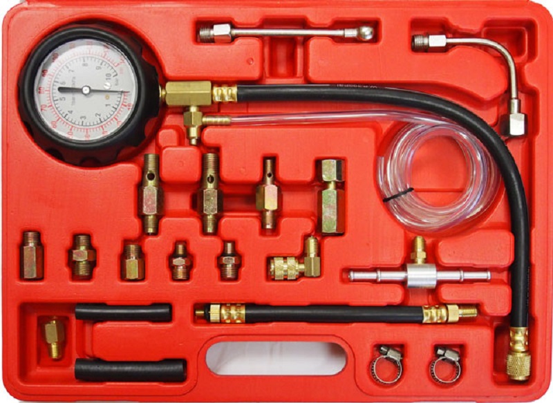 Потребуется всего лишь манометр, предназначенный для замера шин. Но его нужно немного доработать, поменяв шкалу. В инжекторной системе желательно измерять давление со шкалой прибора, которая показывает варьирование в пределах шесть-семь атмосфер. Существуют и иные, более совершенные устройства для измерения. Специализированный инструментальный набор с манометром, сливным шлангом и адаптером можно купить в магазине автозапчастей. Он стоит примерно 1.5 тыс. руб.