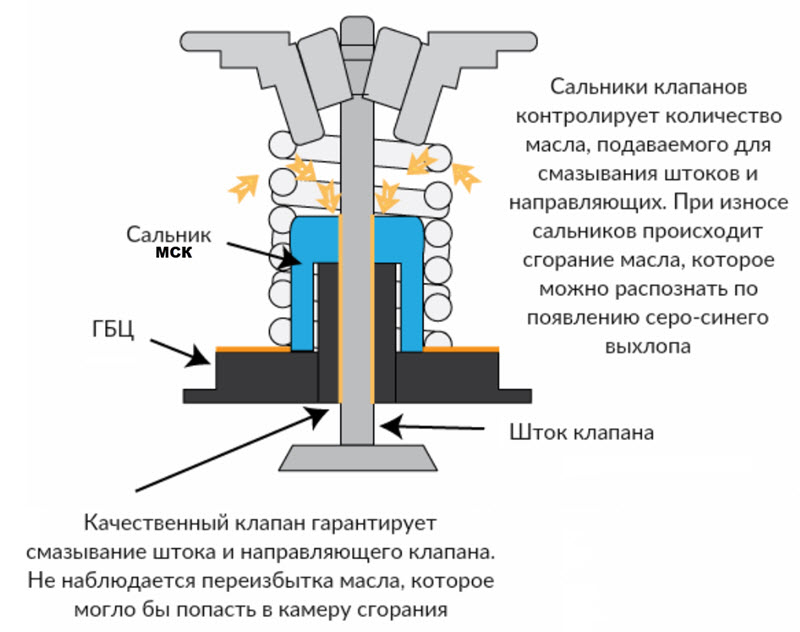 Но наличие зазора означает потерю герметичности картерного пространства, ведь газораспределительный механизм работает в том же масле, что и прочие детали двигателя, его объём свободно сообщается с зоной под поршнями. Тарелки же клапанов находятся в зоне между камерой сгорания и впускным и выпускным коллекторами.