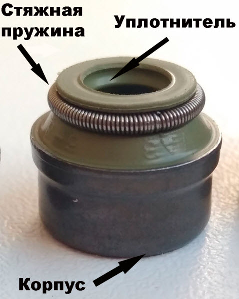 Маслосъёмный колпачок представляет собой классический кольцевой сальник с рабочей кромкой, усиленной стальной пружиной. Нижняя часть представляет собой жестяной цилиндр, покрытый тонким слоем резины. При монтаже он плотно надевается на выступающую часть направляющей втулки клапана.