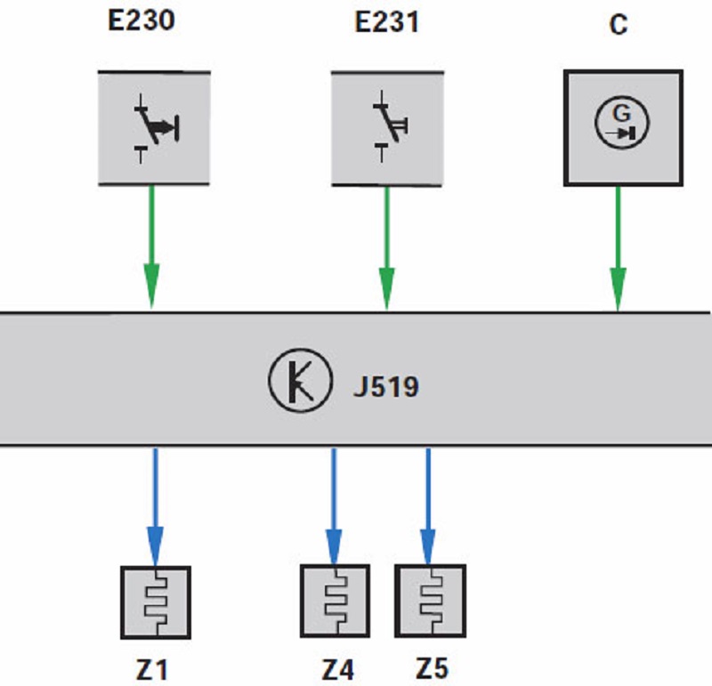 Монтажный блок (1), выключатель зажигания (2), выключатель подогрева заднего стекла (3), контрольная лампочка, сигнализирующая о включении ОЗС (4), нагревательный элемент ОЗС (5).
