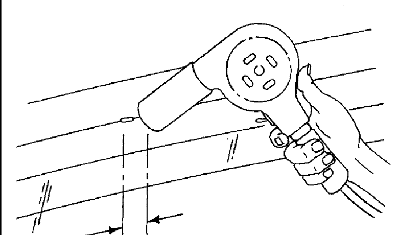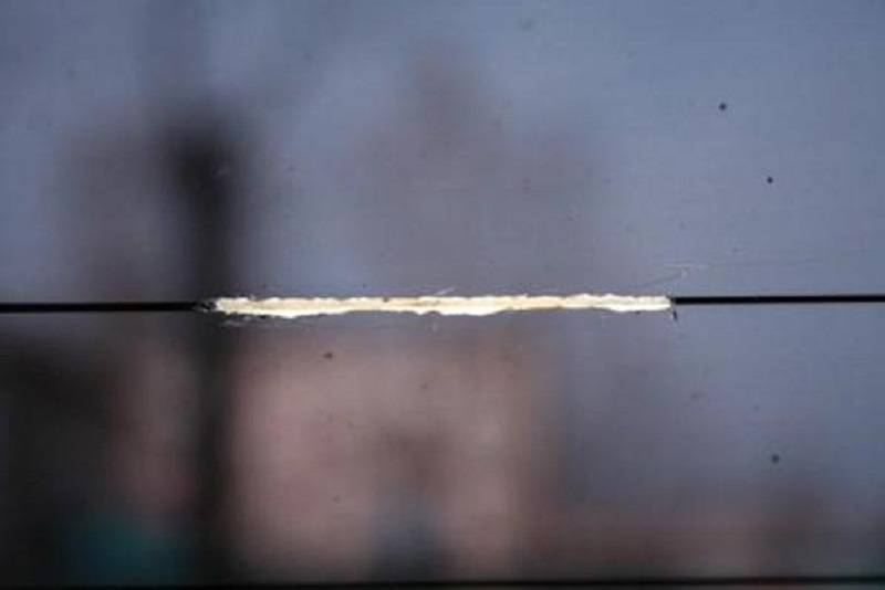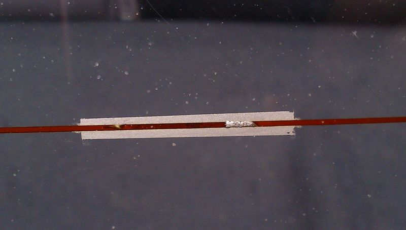 - После высыхания полосы снимите самоклеящуюся ленту, для чего лучше подрезать ее ножом в точке примыкания к ремонтируемой нити.