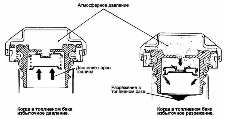 Принцип работы вентиляции большинства машин имеет пороговые величины, срабатывание разгерметизации происходит при перешагивании через эти пороги. Численно они невелики и сохранности формы бензобака или нормальной работе бензонасоса не угрожают.