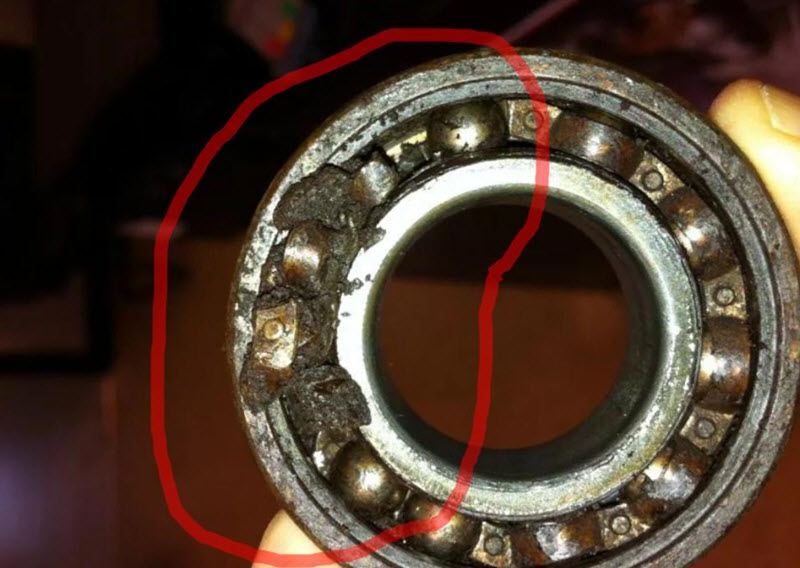 Если разобрать такой подшипник, то можно увидеть увеличенный зазор, следы питтинга и ржавую грязь вместо смазки. Заменяются подшипники или узлы в сборе, например, помпа или ролики.
