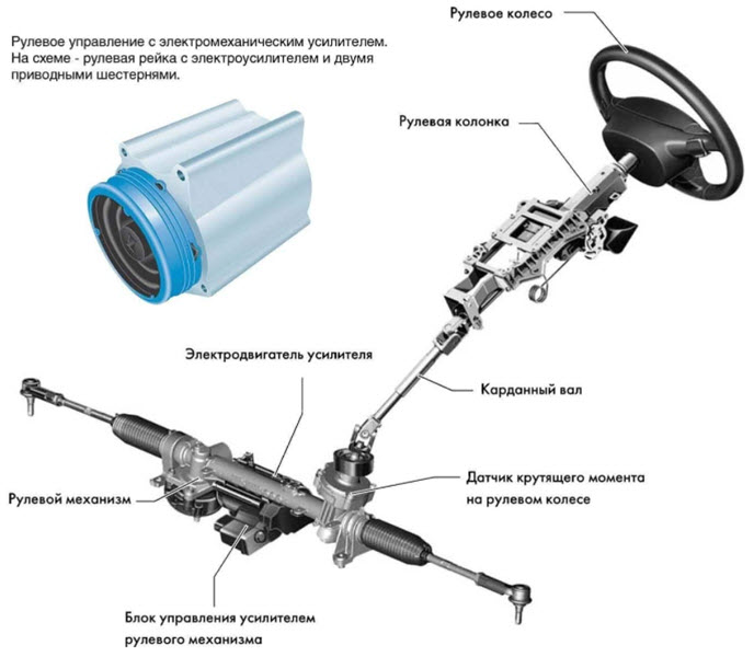 Электроусилитель, если его совмещают с корпусом рулевого механизма, представляет собой электромотор с редуктором, воздействующий на рейку через свою шестерню.