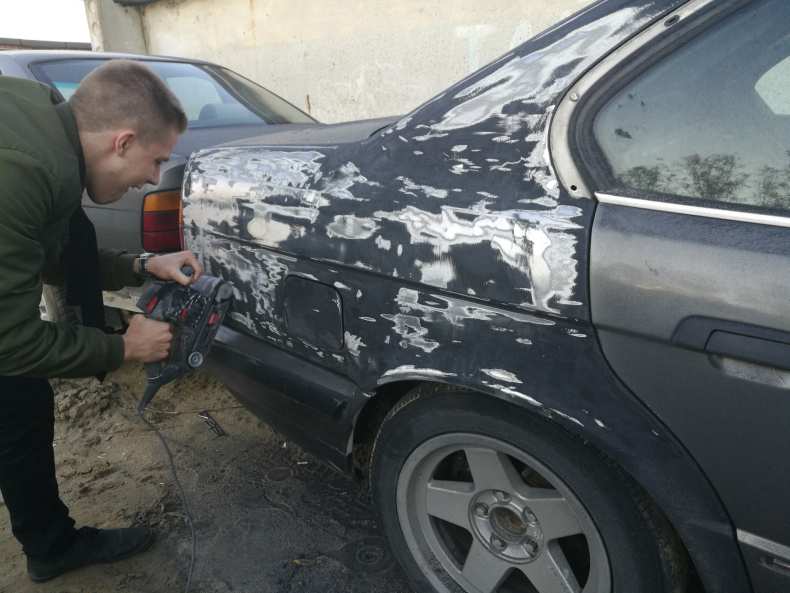 Это важный и достаточно трудоёмкий этап, необходимый для проработки сварочных швов. Зачищать нужно вплоть до основного металла. Для этого хорошо подойдёт наждачная бумага либо шлифовальная машинка. Особое внимание следует уделить местам коррозии, сколов и вмятин.