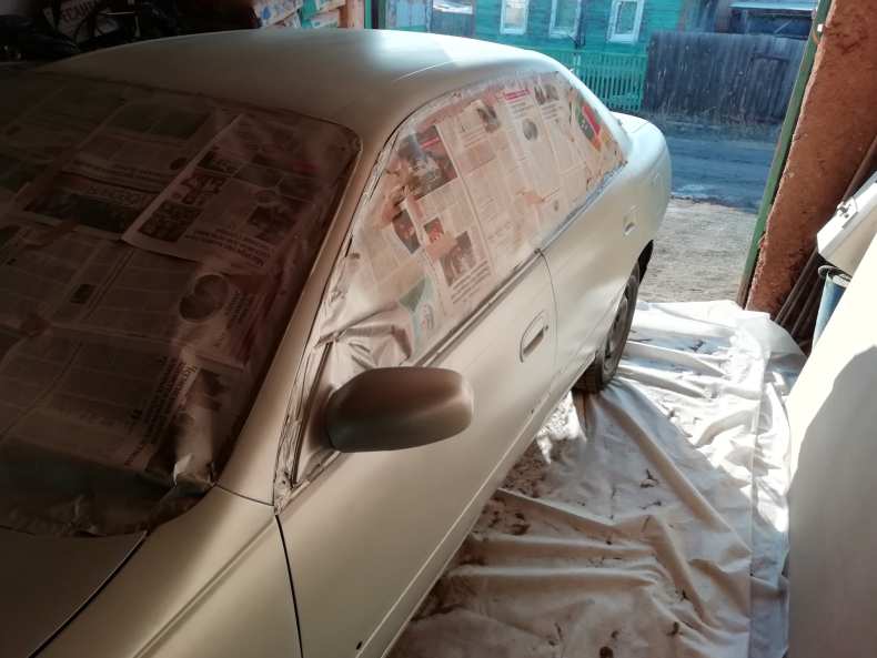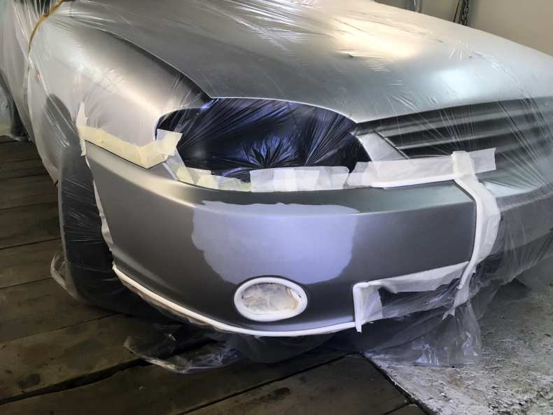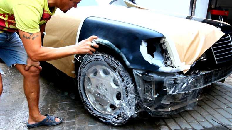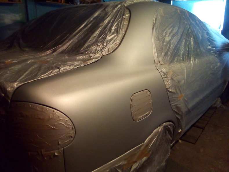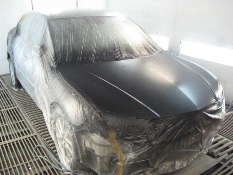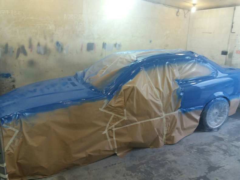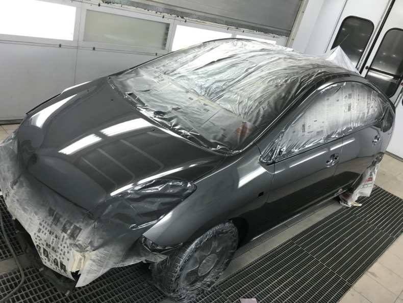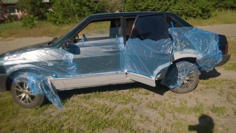 - Кузов или деталь автомобиля тщательно промывают под высоким давлением и высушивают. Части автомобиля, которые не планируется красить, обматываются малярным скотчем и защитной пленкой.