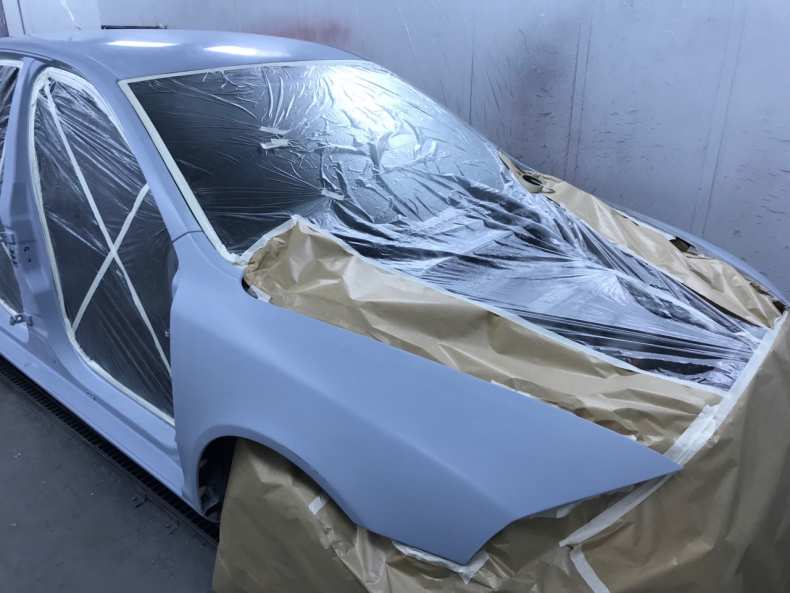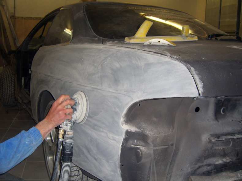 После грунтовки необходимо снова отшлифовать поверхность с помощью P400. Только после этого можно приступать к нанесению краски на поверхность.