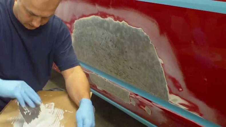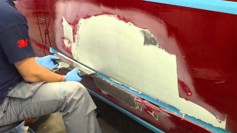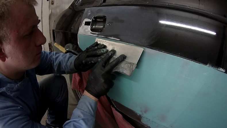 После шлифовки окрашиваемых поверхностей можно приступить к шпаклевке восстанавливаемых участков. Суть заключается в нанесении полиэфирной смеси для заполнения дефектов листового металла.