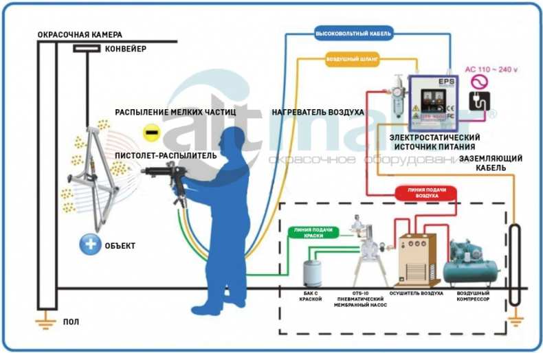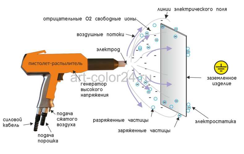 Электростатическая покраска происходит за счет создания электрического поля. Благодаря которому частицы порошка притягиваются на окрашиваемую поверхность. Для того чтобы избежать поражения током, все поверхности в покрасочной камере должны быть заземлены. Окрашиваемая поверхность также должны быть заземлена, чтобы достигнуть качественного покрытия.
