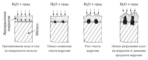 - подпленочная, которая проявляется малозаметными вздутиями на поверхности краски, обнаружить такие места иногда сложно, но в местах поражения могут наблюдаться достаточно глубокие поражения структуры металла, вплоть до сквозных.