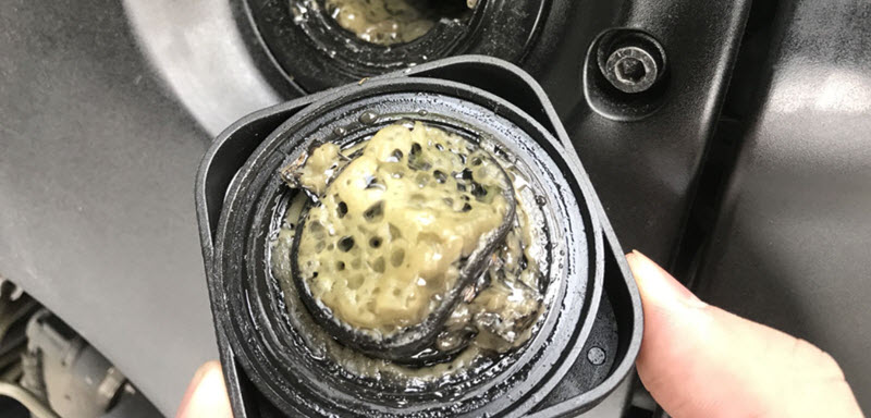 Доступ к жидкостям осуществляется через пробку заливной горловины и измерительный щуп для масла, а состояние антифриза видно при взгляде внутрь расширительного бачка радиатора. На пробке горловины клапанной крышки появится характерный налёт светлой маслянистой эмульсии, она же появится на щупе.