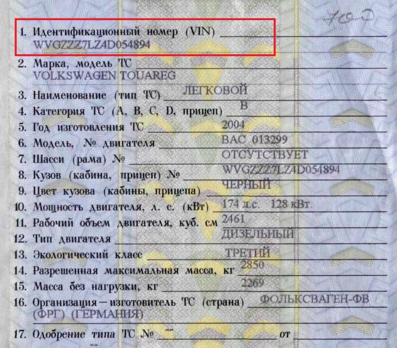 Идентификационный номер документально закреплён в паспорте транспортного средства и в свидетельстве о его регистрации.
