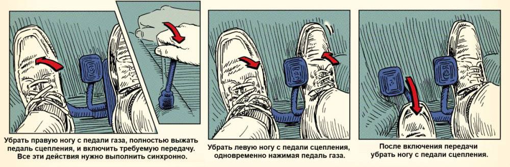 - Когда скорость сброшена, выжимаем сцепление и включаем нужную передачу.
