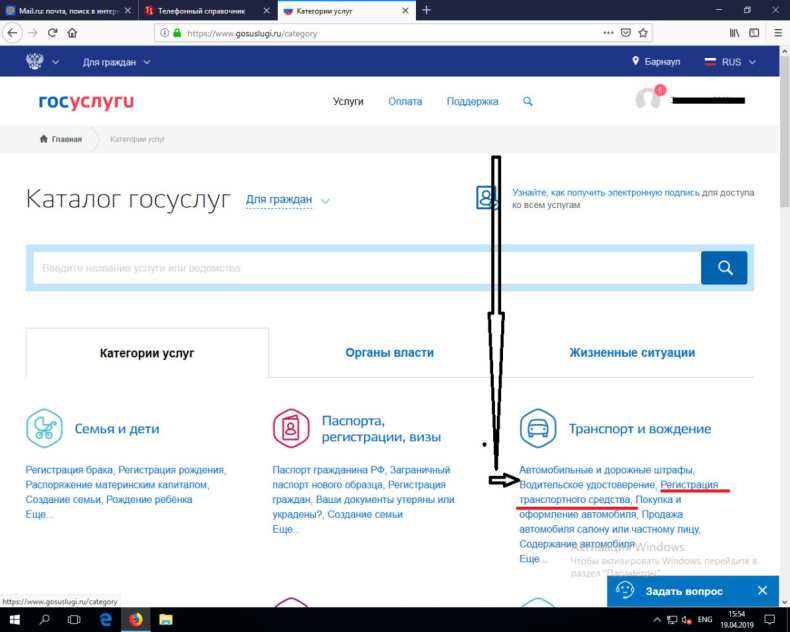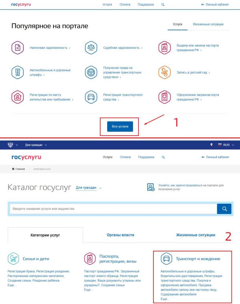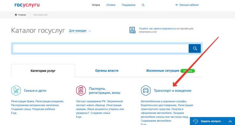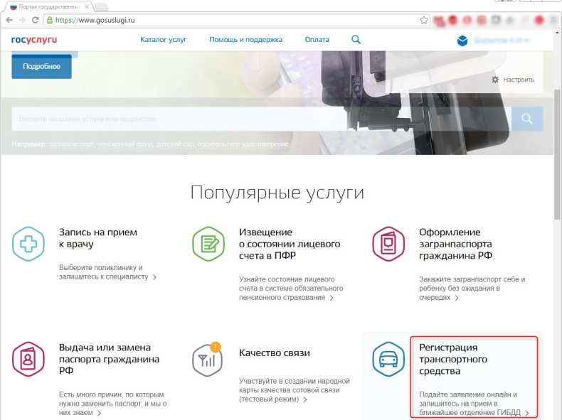 Пользователь должен зайти на сайт Гос услуги. Перейти в приложение «Услуги» или «Популярное на портале». Далее нужно выбрать одну из услуг, в данном случае «Транспорт». Затем нажать на кнопку «Регистрация транспорта».