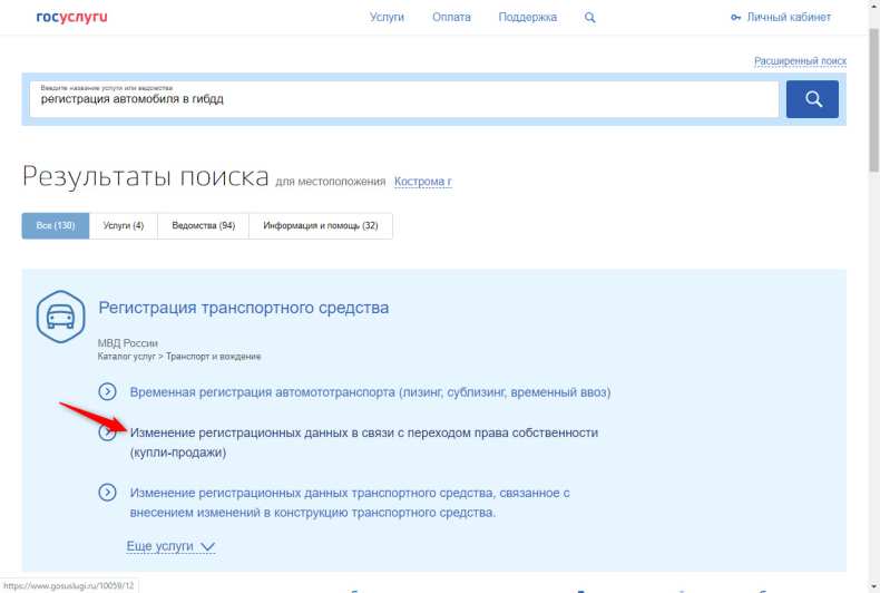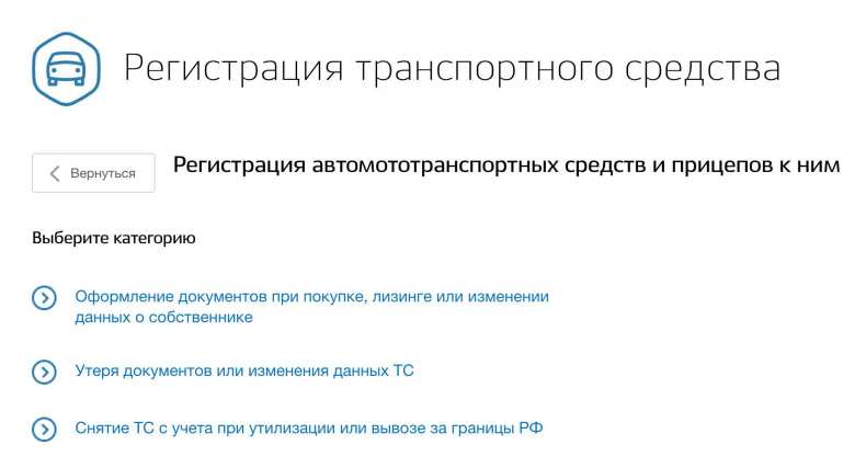 - Дальше выбрать «Регистрация транспортного средства», нажав на вкладку «Покупка и оформление подержанного авто». Здесь будет указана информация, касающаяся б/у автомобиля. Которую нужно заполнить.
