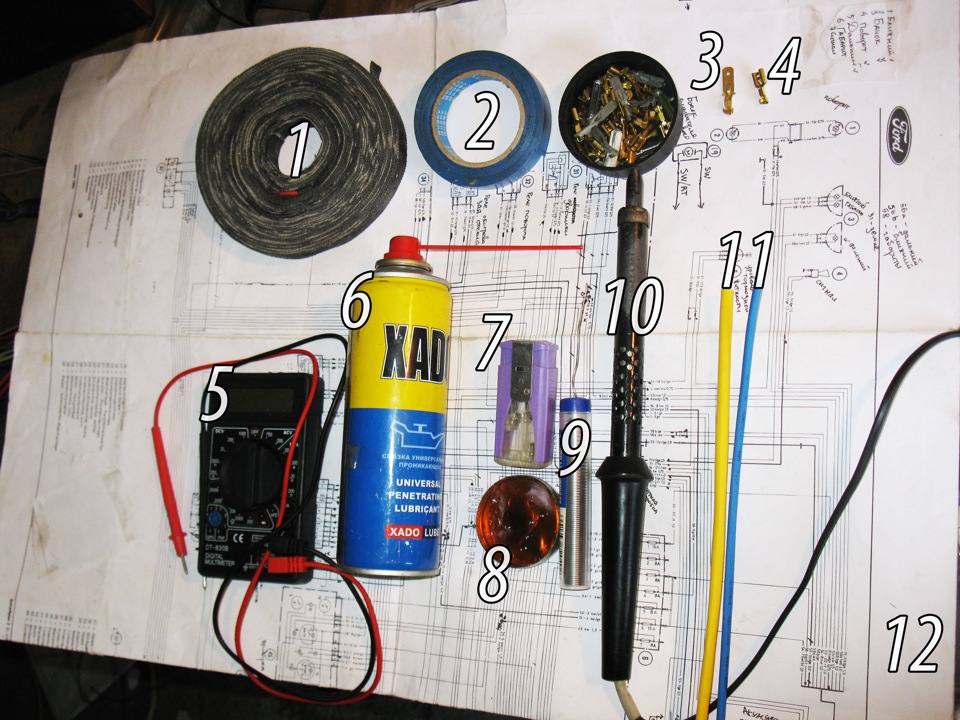5. 6. 7. Паяльник, припой, канифоль. Нужны для спаивания места разрыва проводов. Иначе места разрыва будут окисляться и хуже проводить электричество.