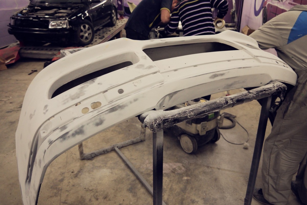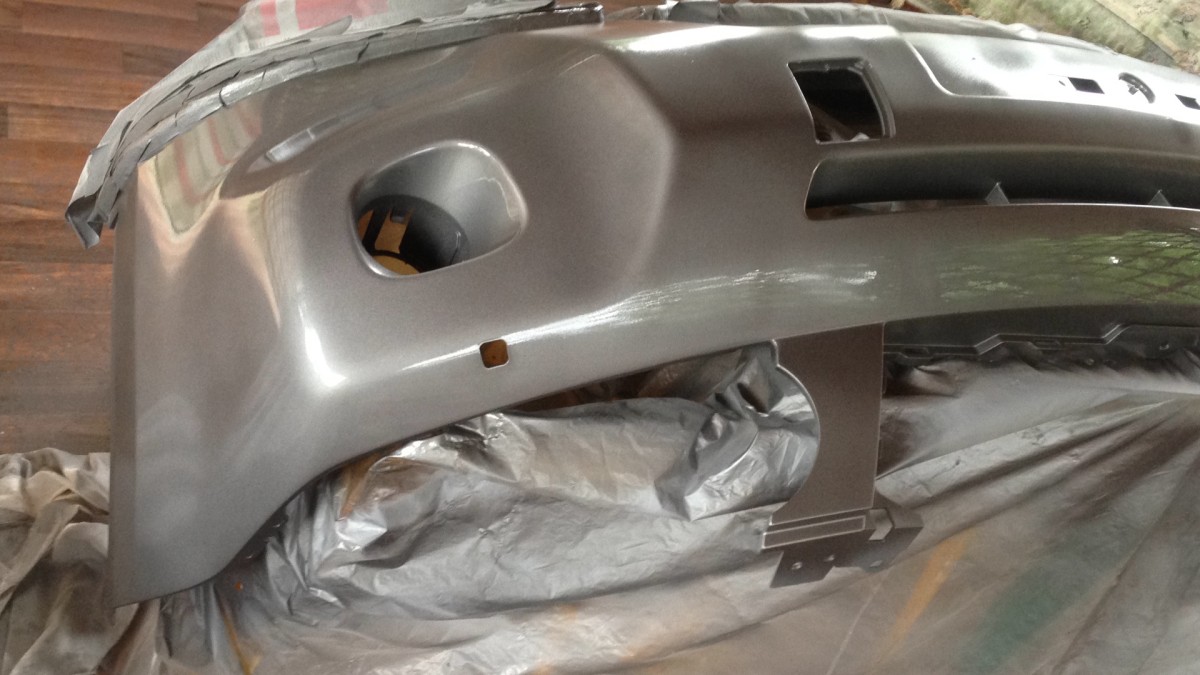 Стараются использовать состав соответствующий цвету бампера. Но, если царапина слишком большая, тогда после нанесения шпатлевки выгоднее покрытие краской.