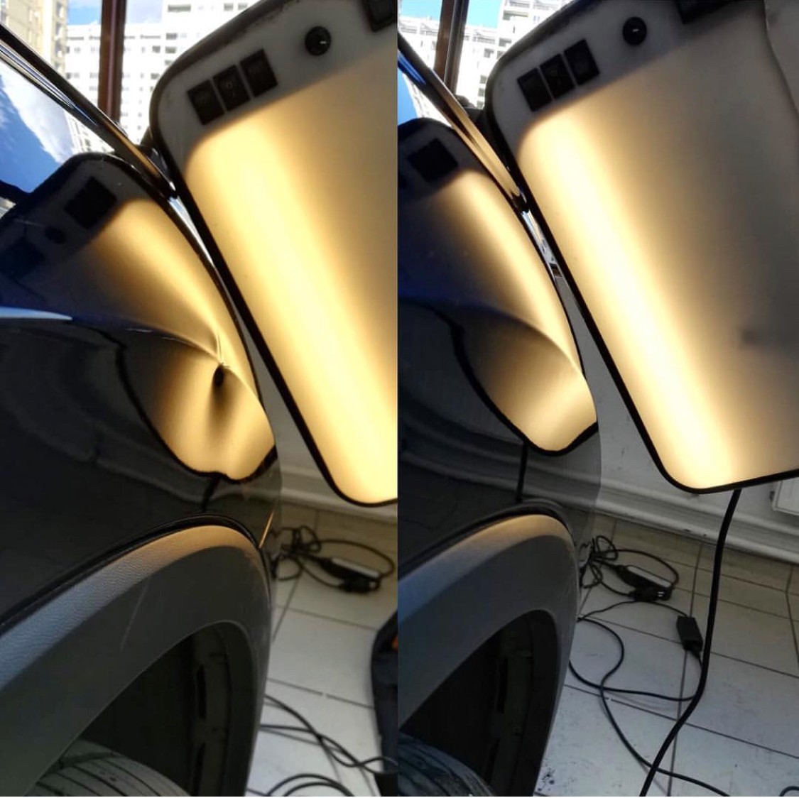 - Устранить вмятину на морально устаревших машинах проблематично. Единственный способ устранить проблему — классическая рихтовка или покраска деталей.
