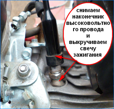 Вставьте провод в свечу (или небольшой кусок резинового шланга), при помощи провода вставьте свечу в отверстие и слегка наживите, теперь снимите этот провод и докрутите свечу зажигания до упора.