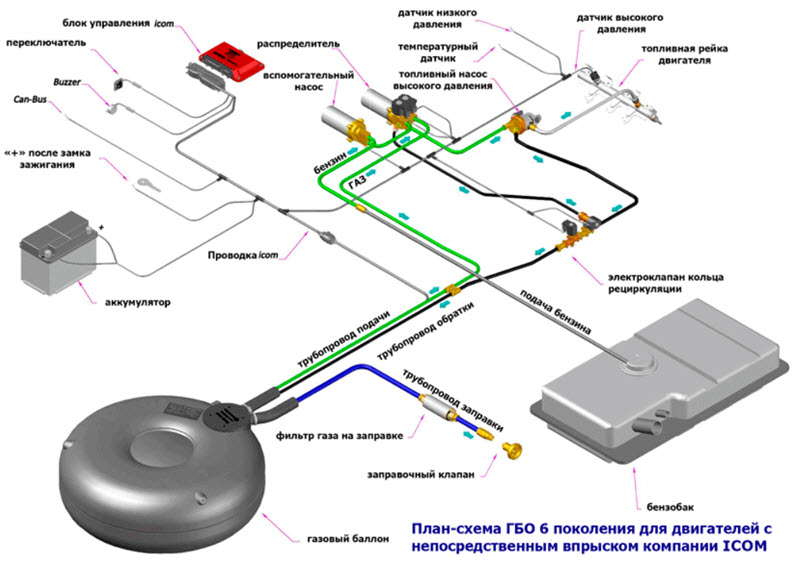 Общий принцип состоит в испарении сжиженного газа, управляемому смешиванию его с воздухом и дозированной подаче в цилиндры. Так как оборудование развивается, на данный момент уже можно выделить несколько поколений ГБО: