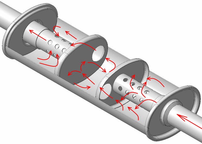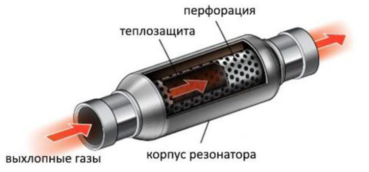 Поставляется выхлоп внутрь через перфорированную трубу. Именно эта перфорация в виде множества отверстий подобранного диаметра и создаёт эффект гашения колебаний, противопоставляя их фазы. Точно такая же труба стоит и на выходе, помогая работать первой. Камера между ними дополнительно сглаживает колебательные процессы.