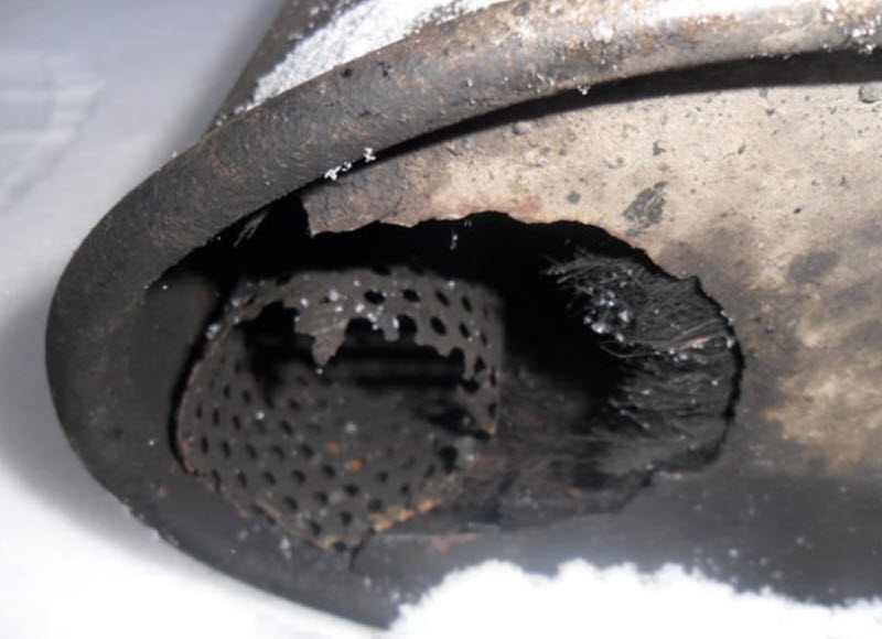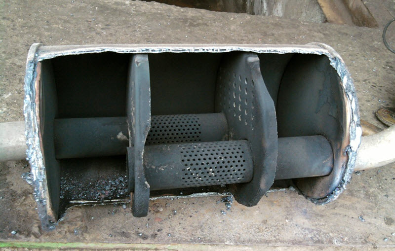 Появление внутри корпуса дребезга металлического типа может означать, что в результате глубокой ржавчины оторвалась какая-либо из деталей и свободно перемещается в потоке газов. Но гораздо хуже повреждения наружного корпуса. Выхлопные газы попадут в салон, что опасно.