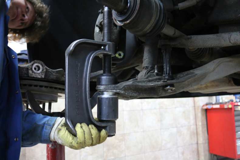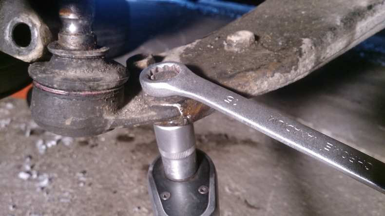 Переднюю шаровую опорную часть можно заменить другим способом, не применяя съемник. Для этого потребуется плотное покрытие на ровном участке, а также набор инструментов, состоящий из: