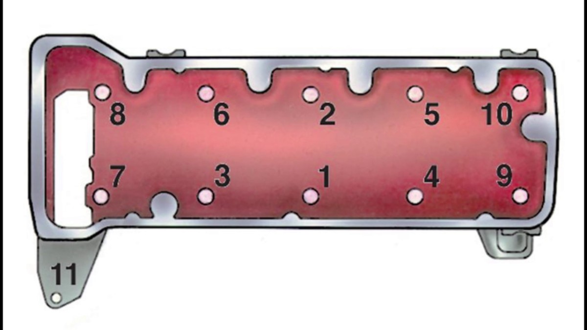 - Рядом с камерами сгорания расположены два ряда фиксирующих компонентов. Натягивать их начинают от середины, сперва прилагая усилие не больше 1 кгс·м. Центральные болты находятся в ДВС L4 между вторым и третьим цилиндрами, в L6 – на противоположной стороне от третьего цилиндра, в V6 – вблизи с центральной камерой сгорания.