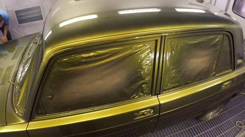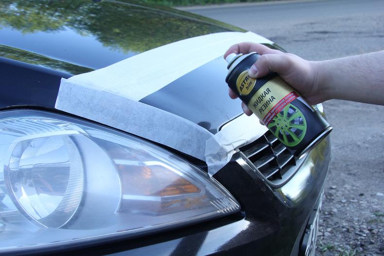 - Следующим этапом будет распределение жидкой резины по периметру железного кузова. Предварительно решётку радиатора, лобовое стекло и бампер закрывают плотным картоном. Область осветительных фар заклеивают бумажным скотчем.